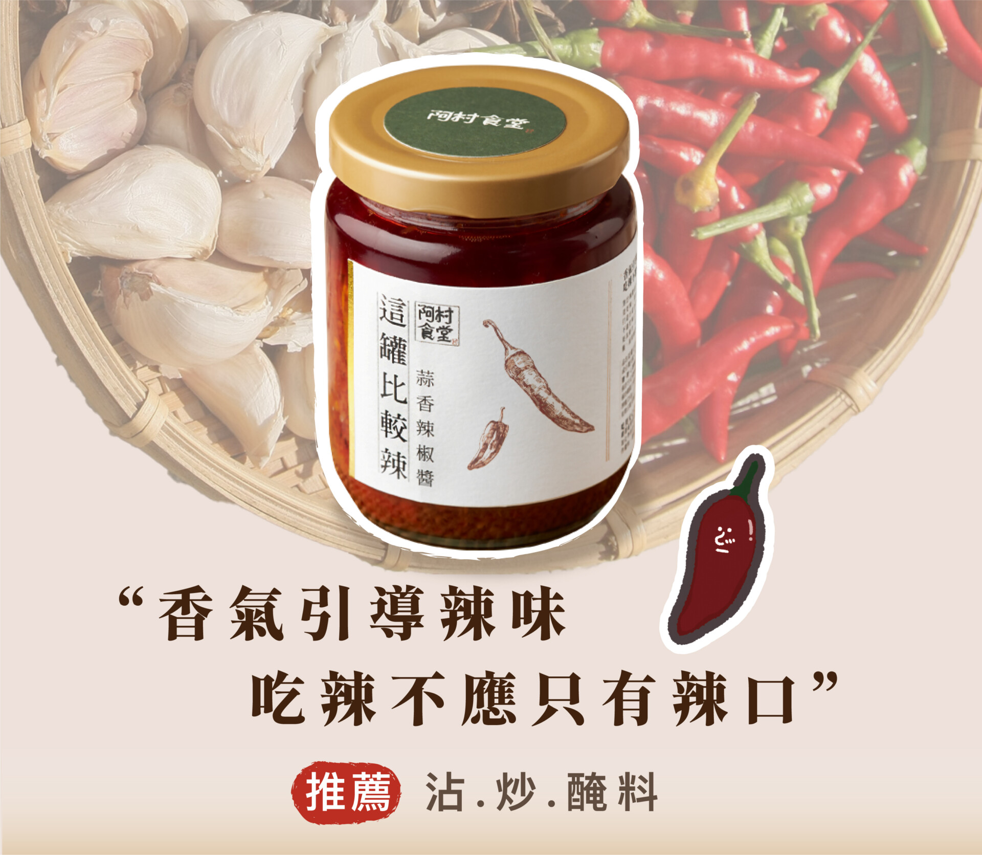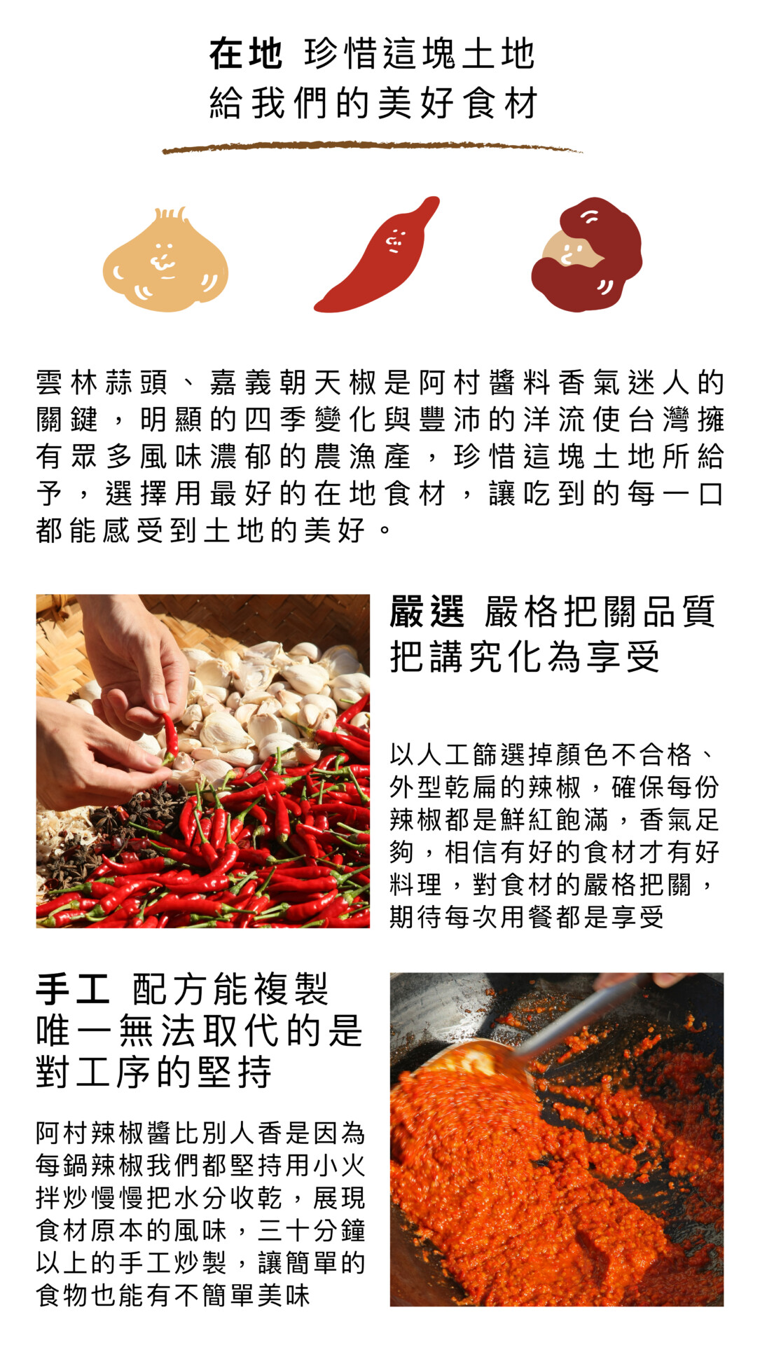 溫潤穩重的麻辣 令人驚艷的味蕾體驗「阿村食堂」這罐比較厲害系列,在地用心經營十餘年絕對不是隨便的口味,源起於傳統並不斷改良,讓記憶中的美好滋味繼續飄香下一個 40 年;雲林蒜頭、嘉義朝天椒及台灣許多在地食材是品村醬料香氣迷人的關鍵,選擇用台灣最好的在地食材,讓吃到的每一口都能感受到土地的美好。從基礎對食材的嚴選,以人工篩選掉顏色不合格,含水率差外型乾扁的辣椒,確保每次炒製的辣椒都是鮮紅飽滿,香氣足夠,再到炒製過程的把關,我們堅持用小火拌炒慢慢把水分收乾,用人工掌握火侯的手工細心炒製,展現食材原本的原味,讓簡單的食材也能散發含有底蘊的風味。
