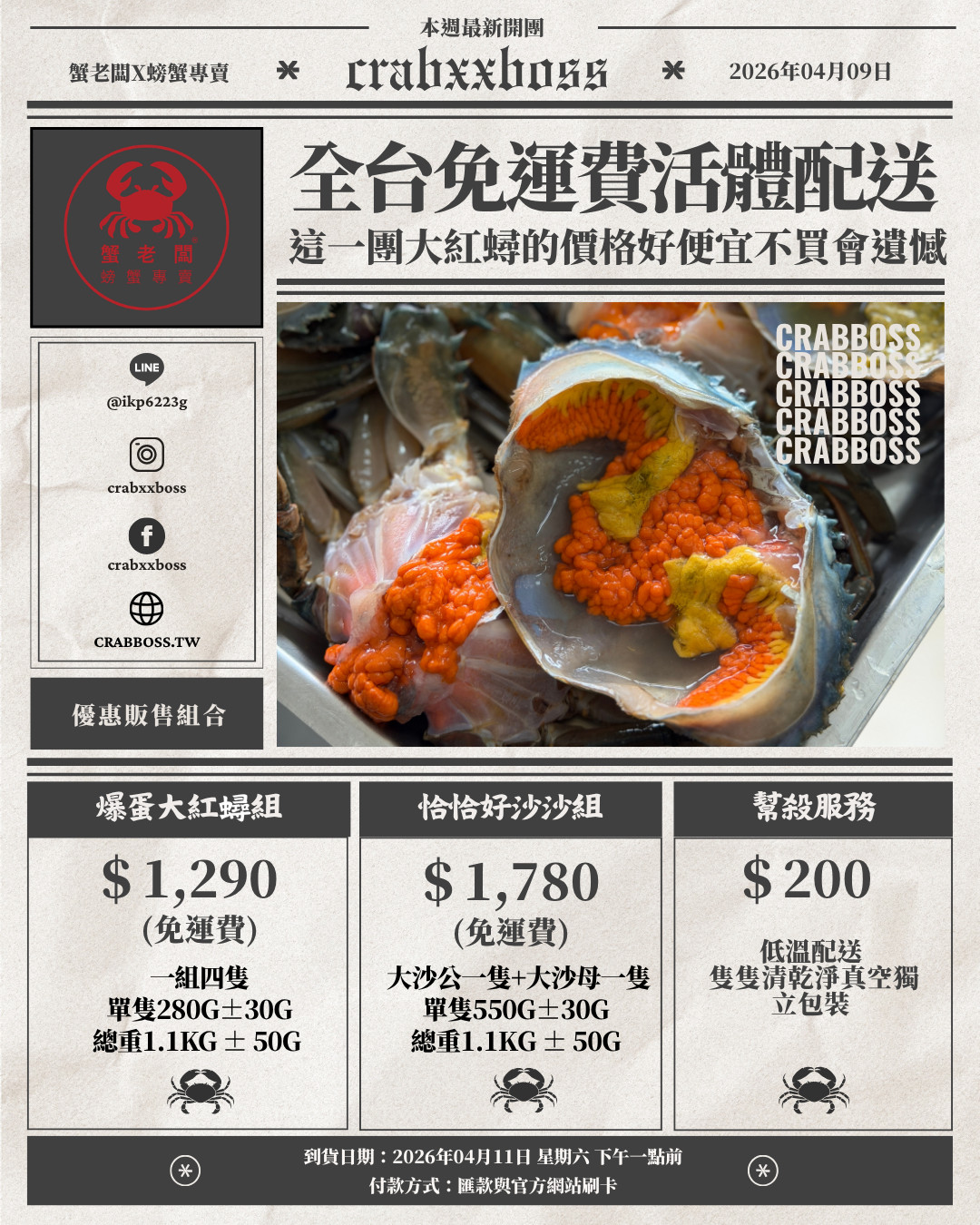 📌蟹老闆小提醒📌因皆為活跳跳免運費到府,成本相當之高,務必確認以下「到貨時段」